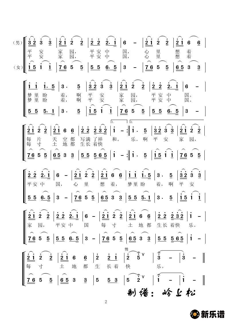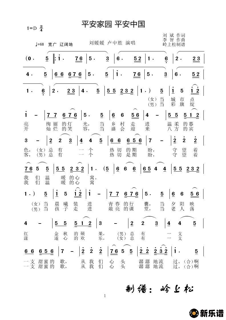 《平安家园 平安中国》简谱 刘媛媛/卢中胜-岭上松制谱