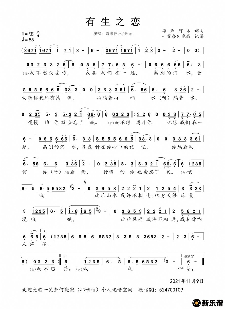 海来阿木、云朵演唱的有生之恋歌词,有生之恋简谱.