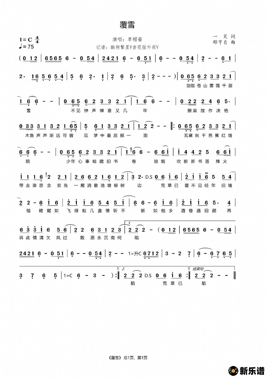 草帽酱演唱的覆雪歌词,覆雪简谱.