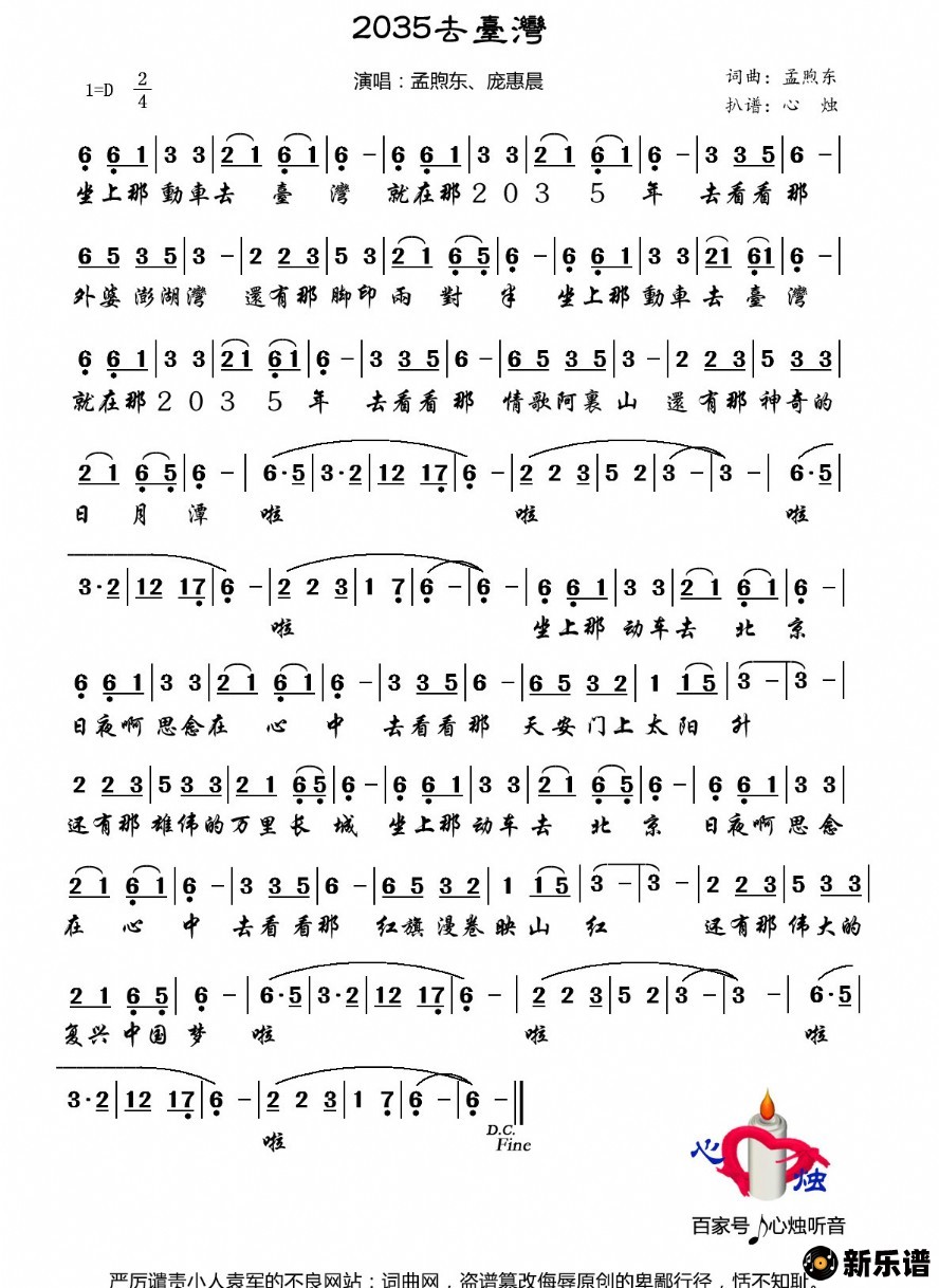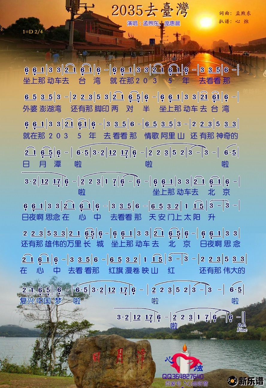 2035去台湾孟煦东、庞惠晨 孟煦东、庞惠晨演唱的2035去台湾歌词,2035去台湾简谱. 坐上那动车去台湾就在那2035年去看看那外婆澎湖湾还有那脚印两对半坐上那动车去台湾就在那2035年去看看那情歌阿里山还有那神奇的日月潭啦啦啦啦啦啦啦啦啦啦啦啦啦啦啦啦啦啦啦啦啦啦啦啦啦啦啦啦啦啦啦啦坐上那动车去北京日夜思念啊在心中去看看那天安门上太阳升还有那雄伟的万里长城坐上那动车去北京日夜思念啊在心中去看看那红旗漫卷映山红还有那伟大的复兴中国梦坐上那动车去台湾就在那2035年去看看那外婆澎湖湾还有那脚印两对半坐上那动车去台湾就在那2035年去看看那情歌阿里山还有那神奇的曰月潭啦啦啦啦啦啦啦啦啦啦啦啦啦啦啦啦啦啦啦啦啦啦啦啦啦啦啦啦啦啦啦啦坐上那动车去北京日夜思念啊在心中去看看那天安门上太阳升还有那雄伟的万里长城坐上那动车去北京日夜思念啊在心中去看看那红旗漫卷映山红还有那伟大的复兴中国梦啦啦啦啦啦啦啦啦啦 此简谱由新乐谱会员 心烛 上传