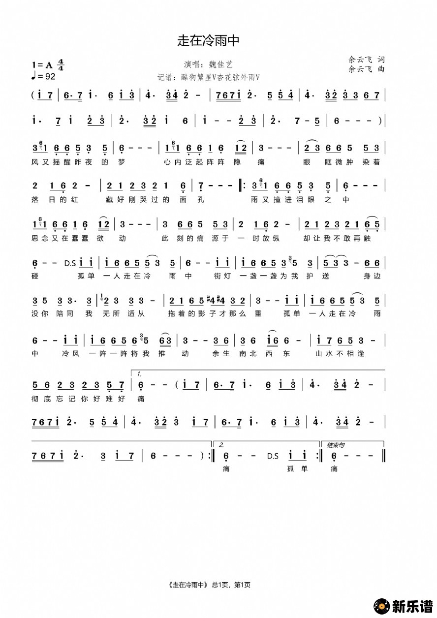 魏佳艺演唱的走在冷雨中歌词,走在冷雨中简谱.