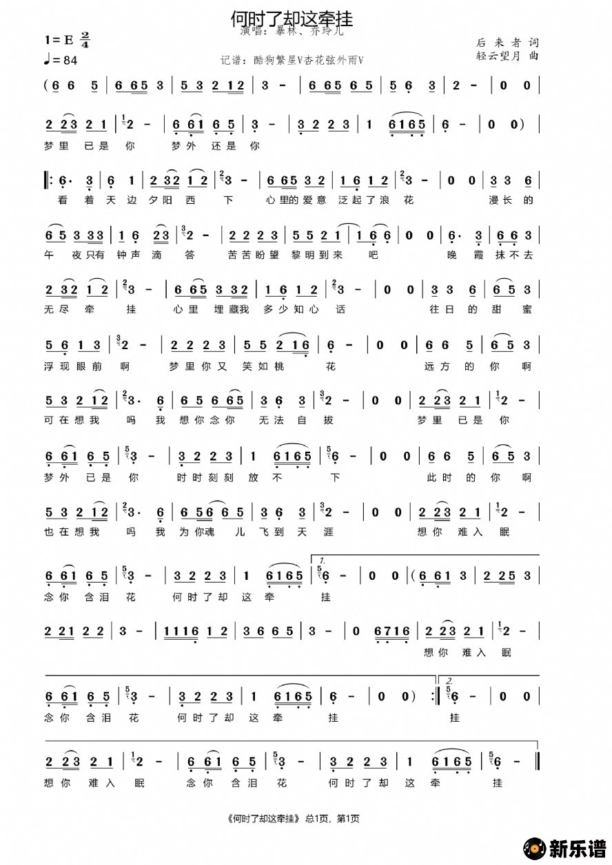 《何时了却这牵挂》简谱 暴林、乔玲儿-杏花弦外雨制谱