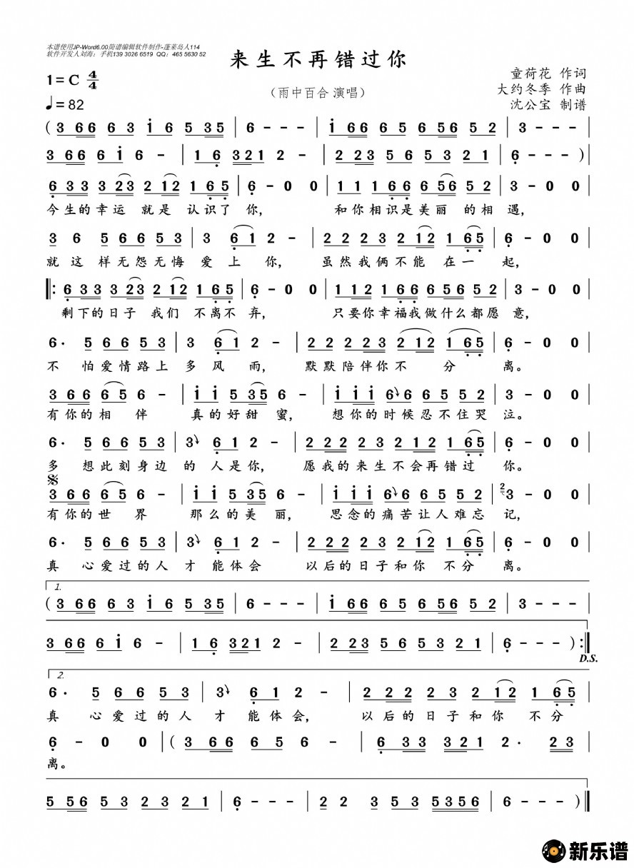 来生不再错过你雨中百合 雨中百合演唱的来生不再错过你歌词,来生不再错过你简谱. 今生的幸运就是认识了你和你相识是美丽的相遇就这样无怨无悔爱上你虽然我俩不能在一起剩下的日子我们不离不弃只要你幸福我做什么都愿意不怕爱情路上多风雨默默陪伴你不分离有你的相伴真的好甜蜜想你的时候忍不住哭泣多想此刻身边的人是你愿我的来生不会再错过你有你的世界那么的美丽思念的痛苦让人难忘记真心爱过的人才能体会以后的日子和你不分离剩下的日子我们不离不弃只要你幸福我做什么都愿意不怕爱情路上多风雨默默陪伴你不分离有你的相伴真的好甜蜜想你的时候忍不住哭泣多想此刻身边的人是你愿我的来生不会再错过你有你的世界那么的美丽思念的痛苦让人难忘记真心爱过的人才能体会以后的日子和你不分离有你的世界那么的美丽思念的痛苦让人难忘记真心爱过的人才能体会以后的日子和你不分离真心爱过的人才能体会以后的日子和你不分离 此简谱由新乐谱会员 沈公宝 上传
