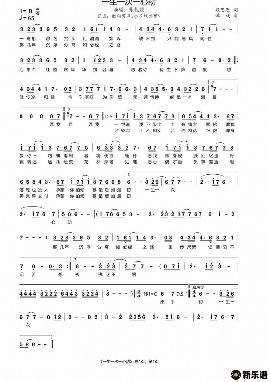张靓颖演唱的一生一次心一动(《斛珠夫人》电视剧情感主题曲)歌词,一生一次心一动(《斛珠夫人》电视剧情感主题曲)简谱.