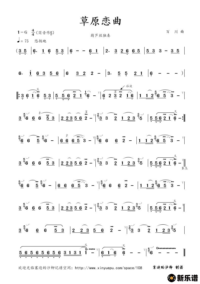 《草原恋曲》简谱 葫芦丝独奏-塞边的沙柳制谱