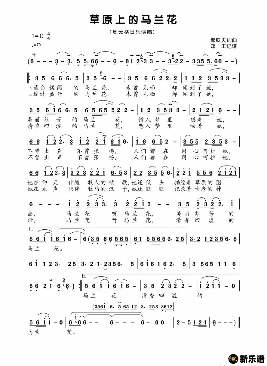 《草原上的马兰花》简谱 奥云格日乐-郑工制谱