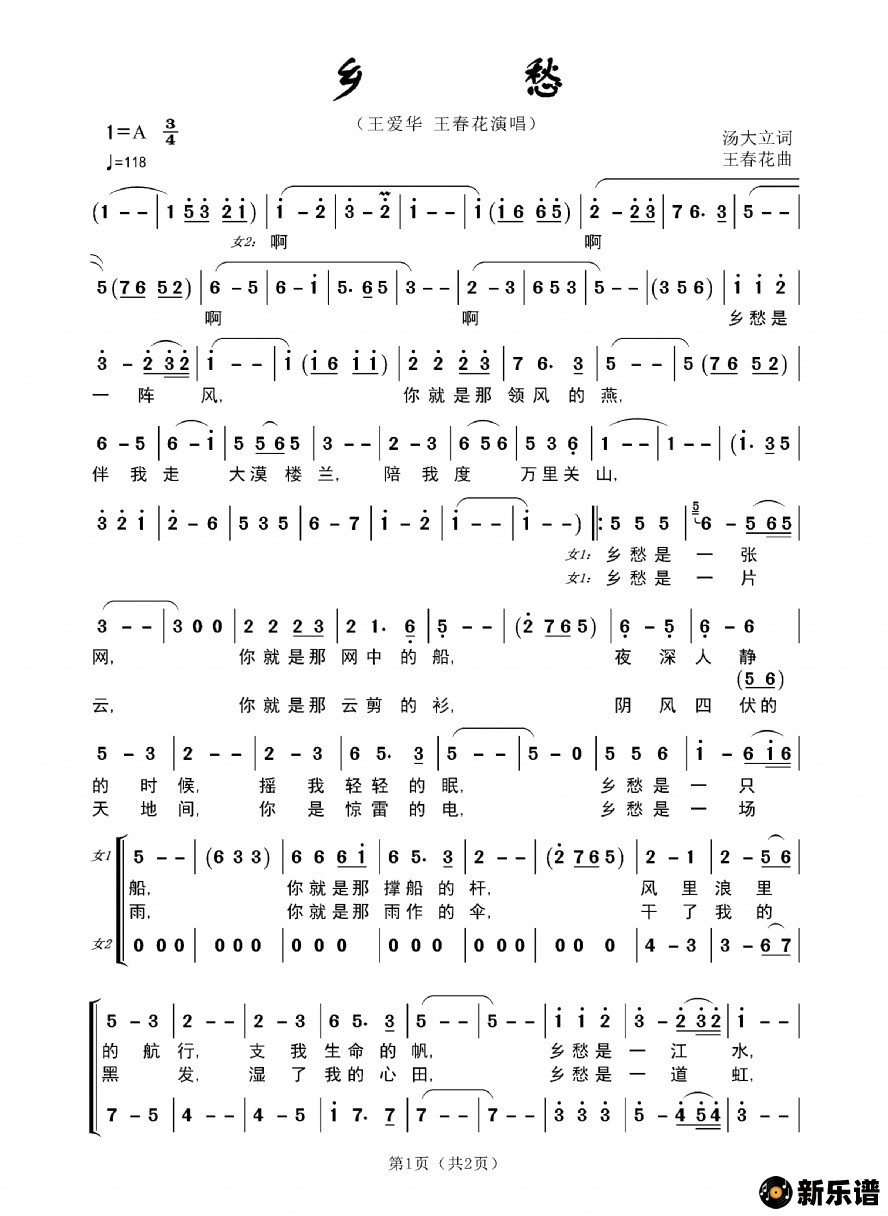 王爱华、王春花演唱的乡愁(女声二重唱)歌词,乡愁(女声二重唱)简谱.