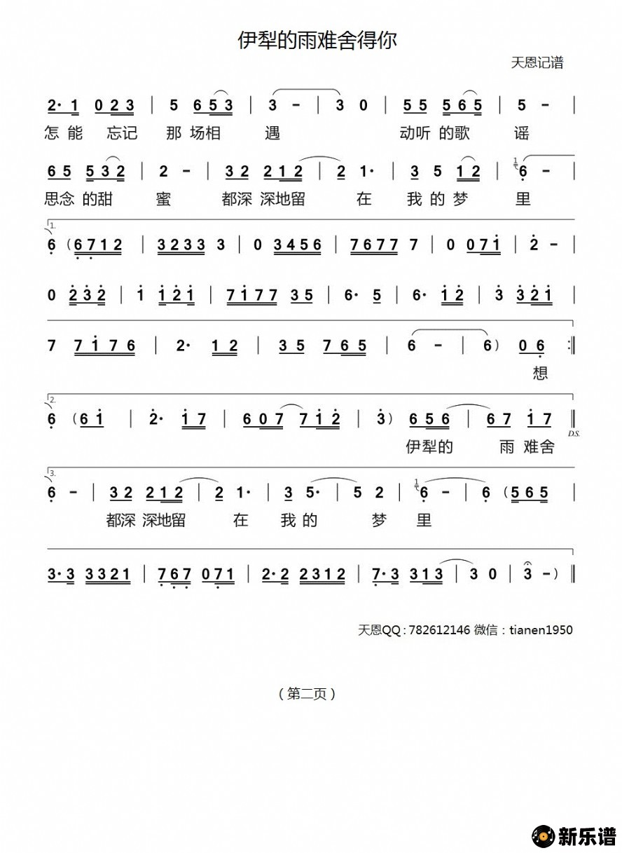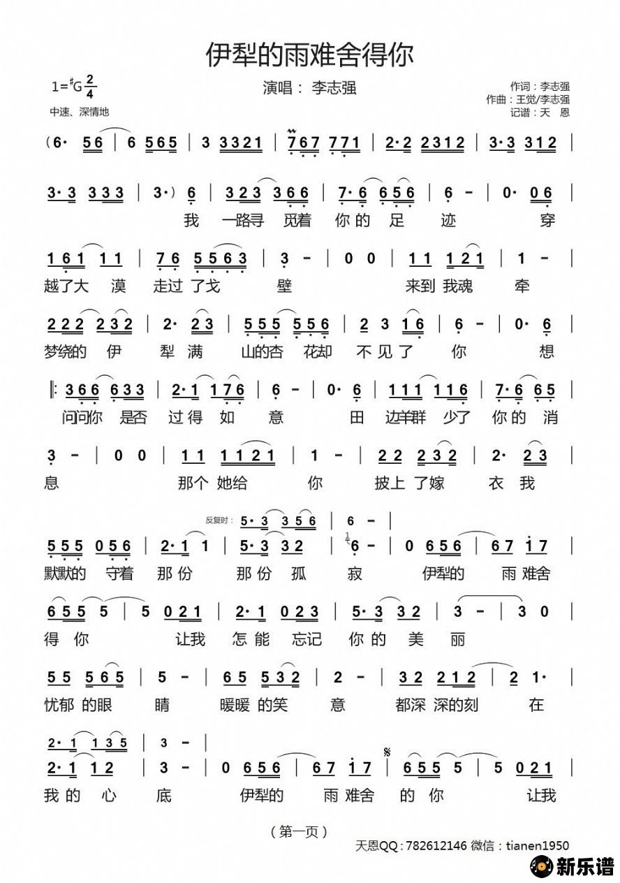 《伊犁的雨难舍得你》简谱 李志强-天恩制谱