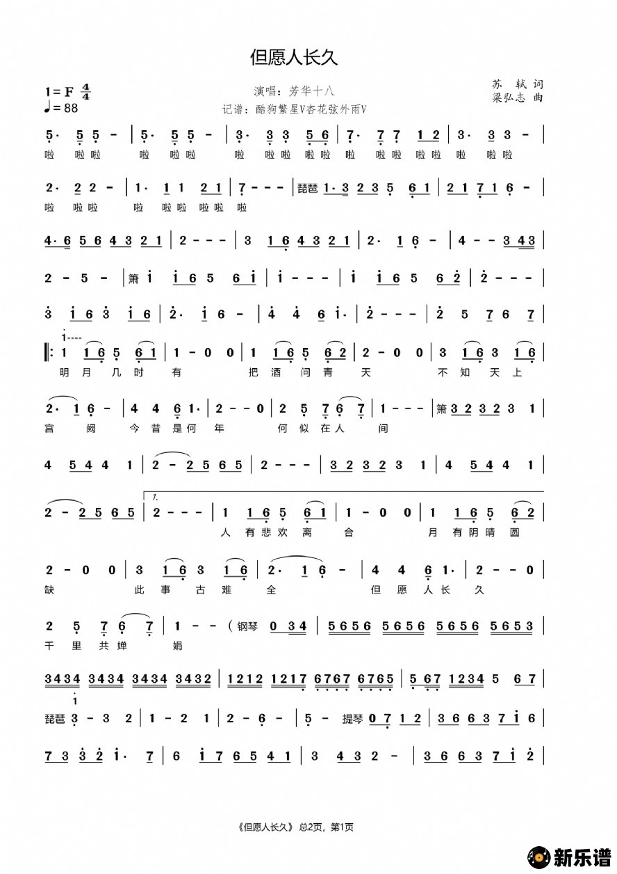 但愿人长久最新曲谱