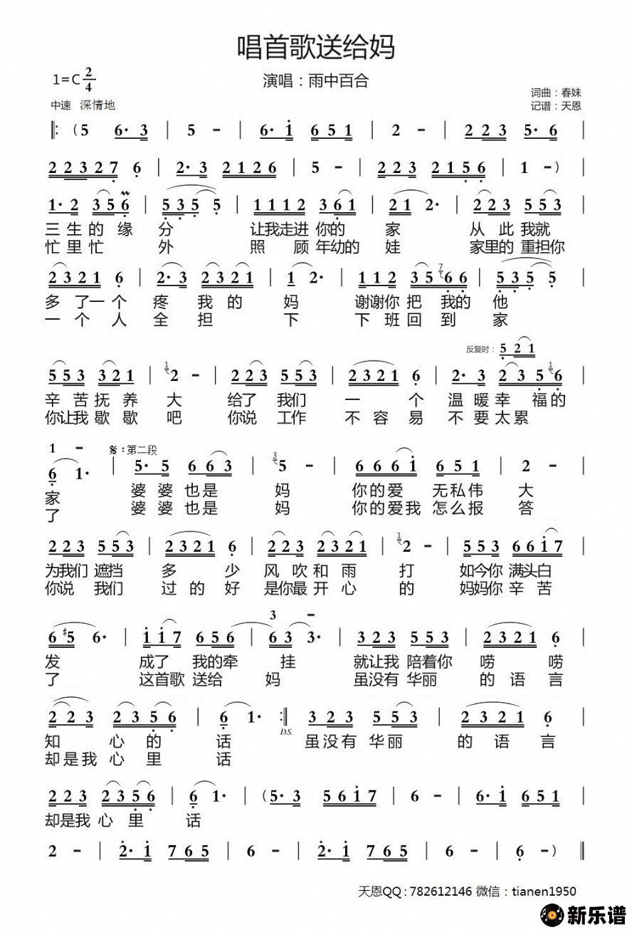 《唱首歌送给妈》简谱 雨中百合-天恩制谱