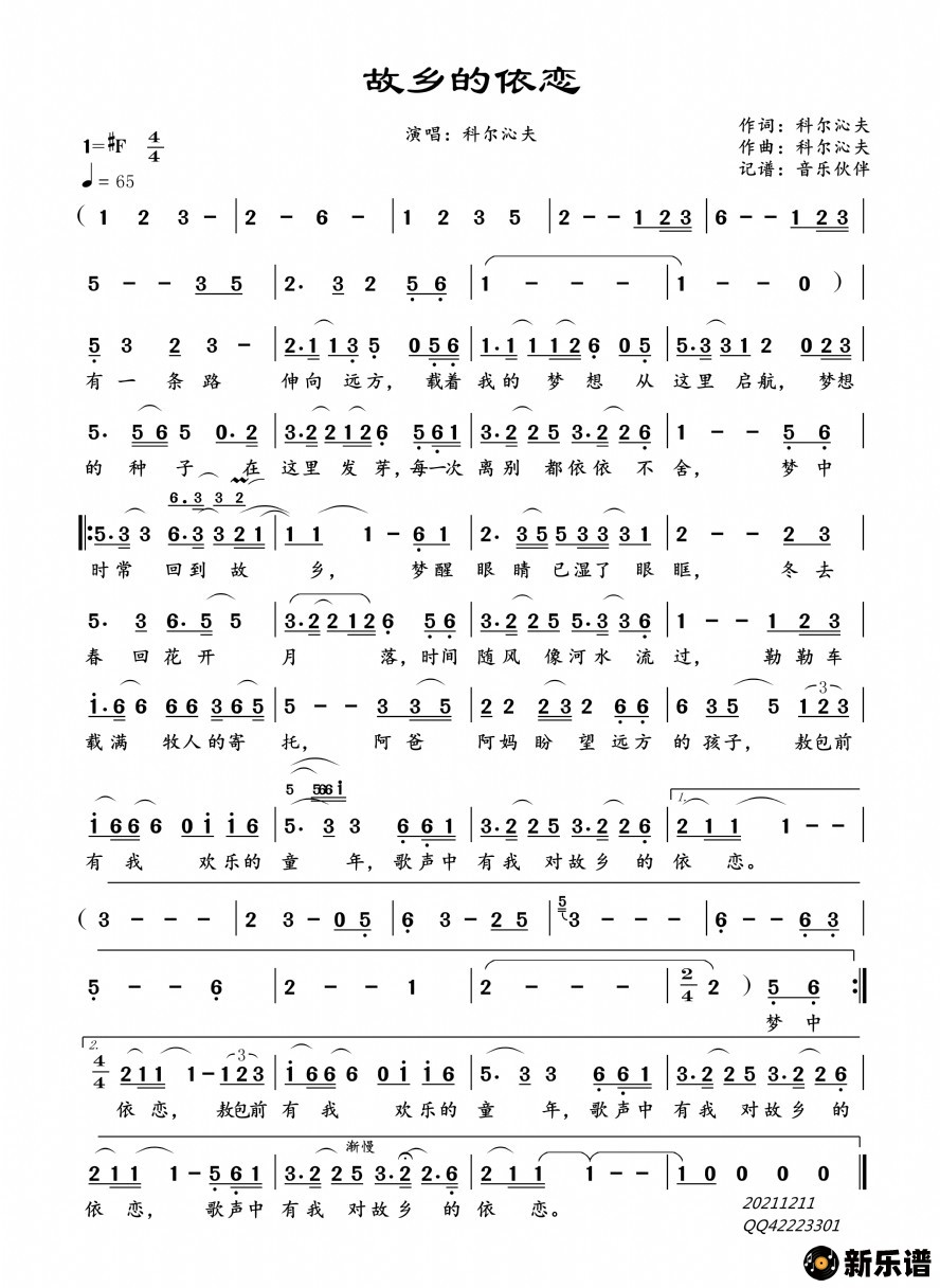 科尔沁夫演唱的故乡的依恋歌词,故乡的依恋简谱.