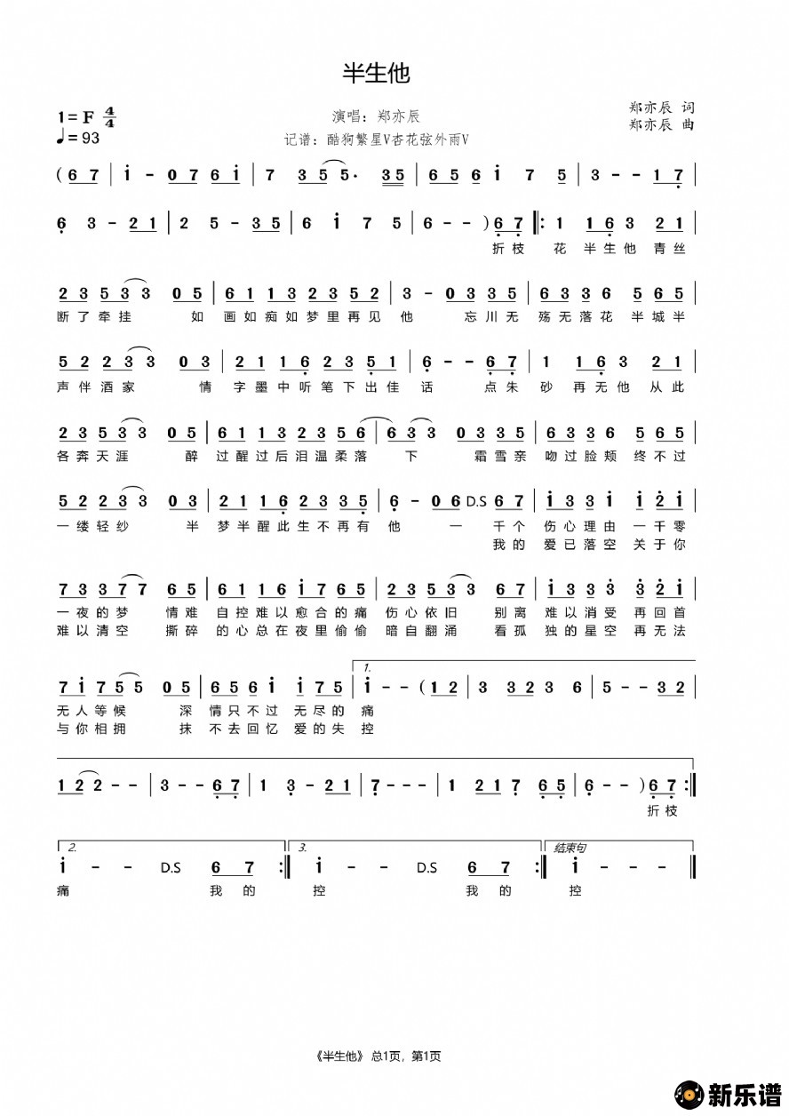 郑亦辰演唱的半生他歌词,半生他简谱.