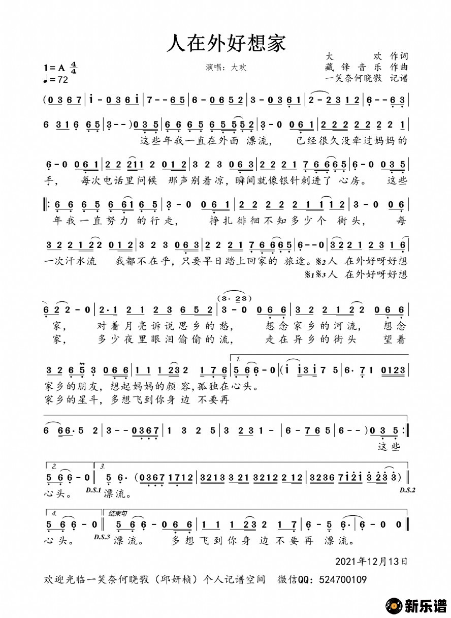 大欢演唱的人在外好想家歌词,人在外好想家简谱.