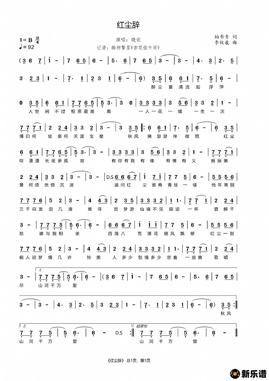 《红尘辞》简谱 晓依-杏花弦外雨制谱