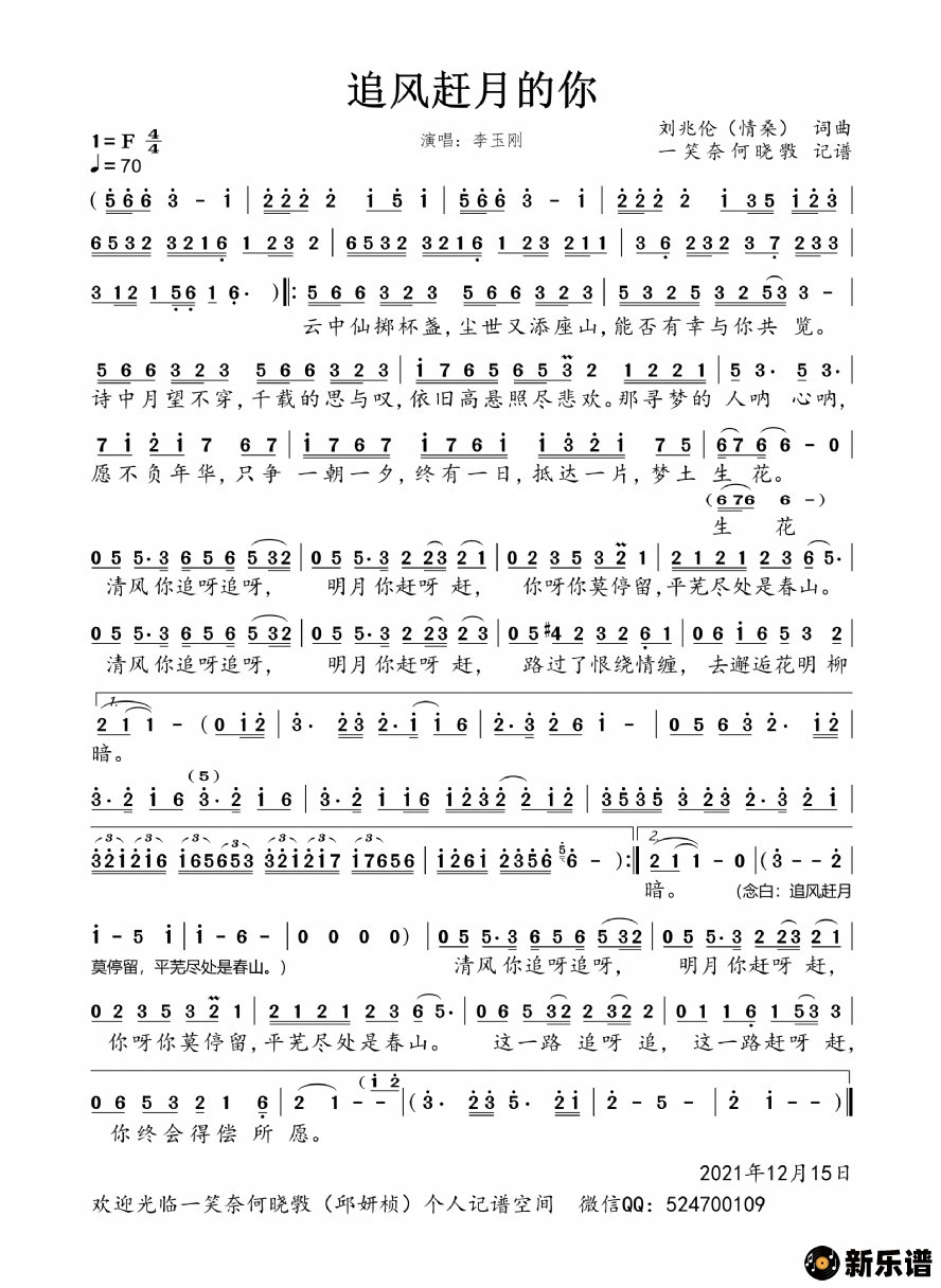 李玉刚演唱的追风赶月的你歌词,追风赶月的你简谱.