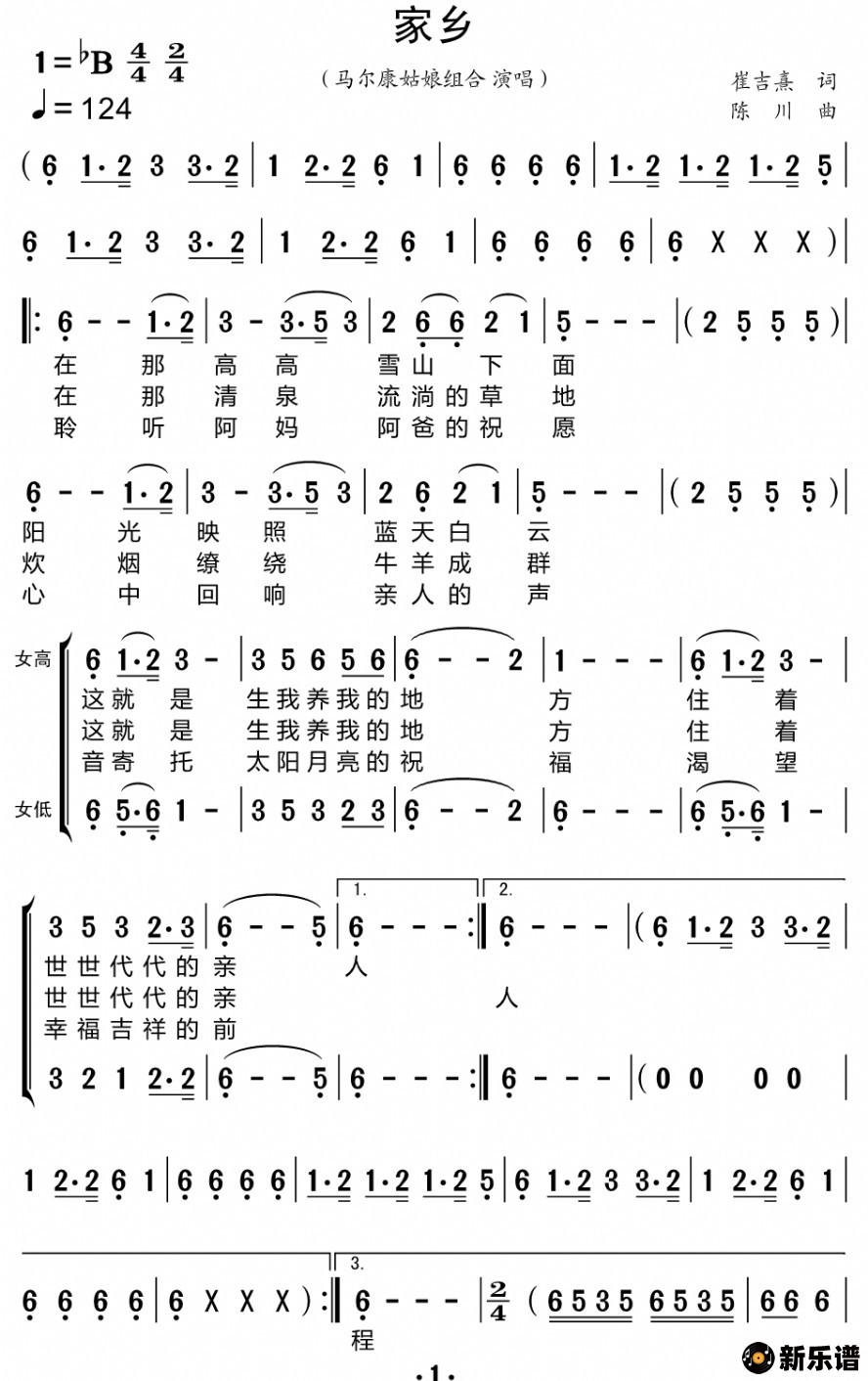 《家乡》简谱 马尔康姑娘组合-小叶子制谱