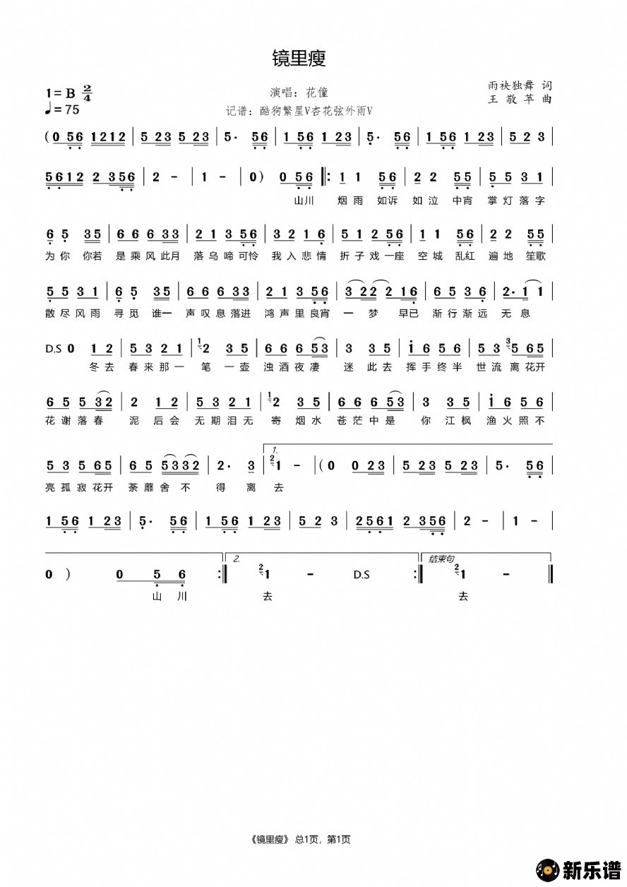 《镜里瘦》简谱 花僮-杏花弦外雨制谱