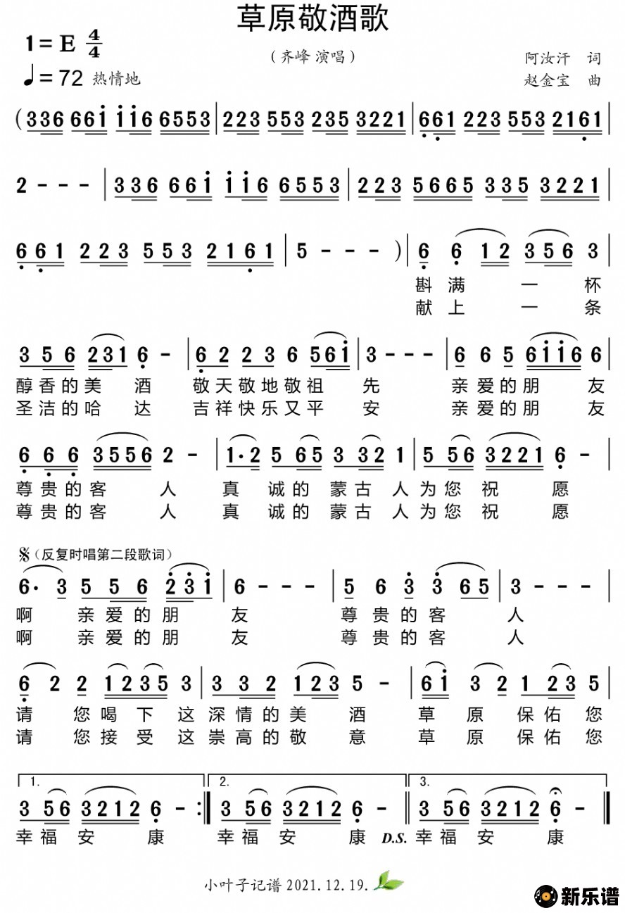 《草原敬酒歌》简谱 齐峰-小叶子制谱
