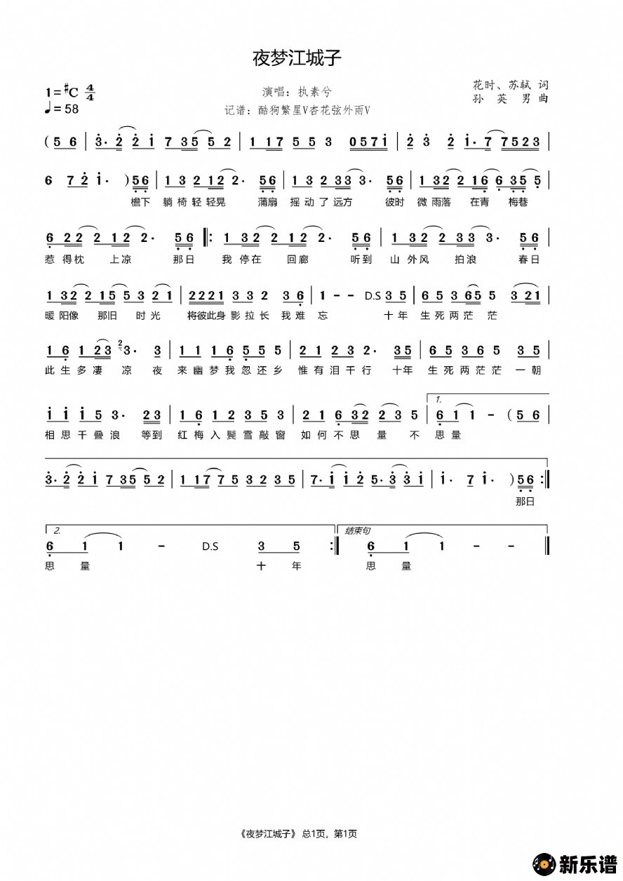 夜梦江城子/执素兮 相关曲谱