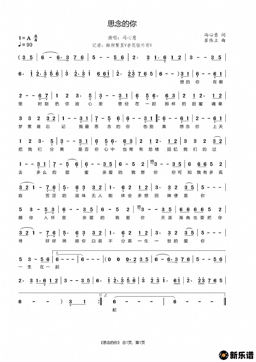 冯心意演唱的思念的你歌词,思念的你简谱.