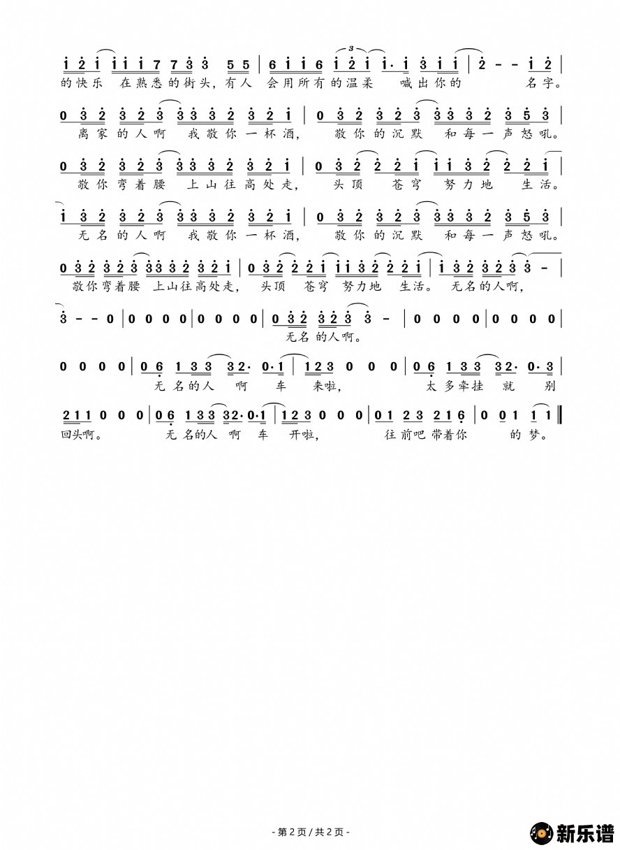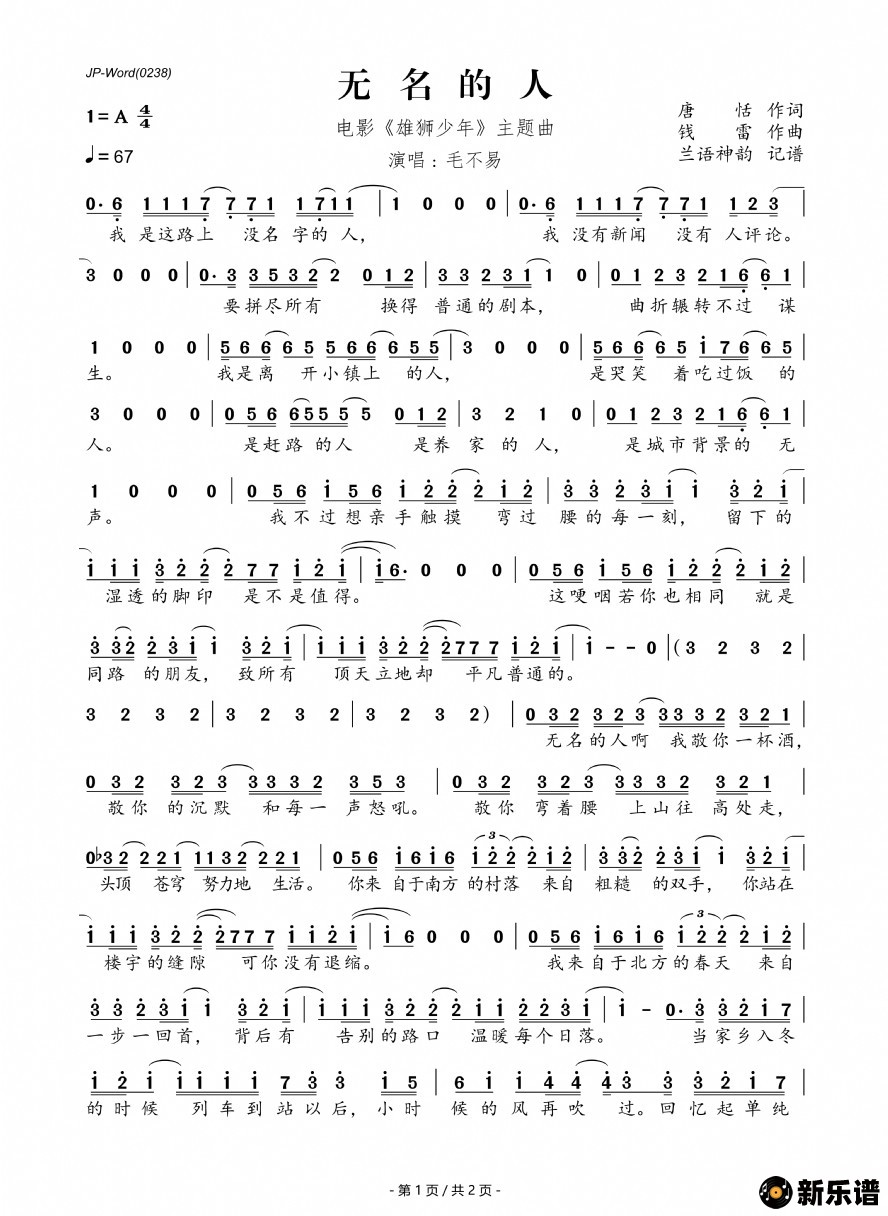 《无名的人(电影《雄狮少年》主题曲)》简谱 毛不易-兰语神韵制谱