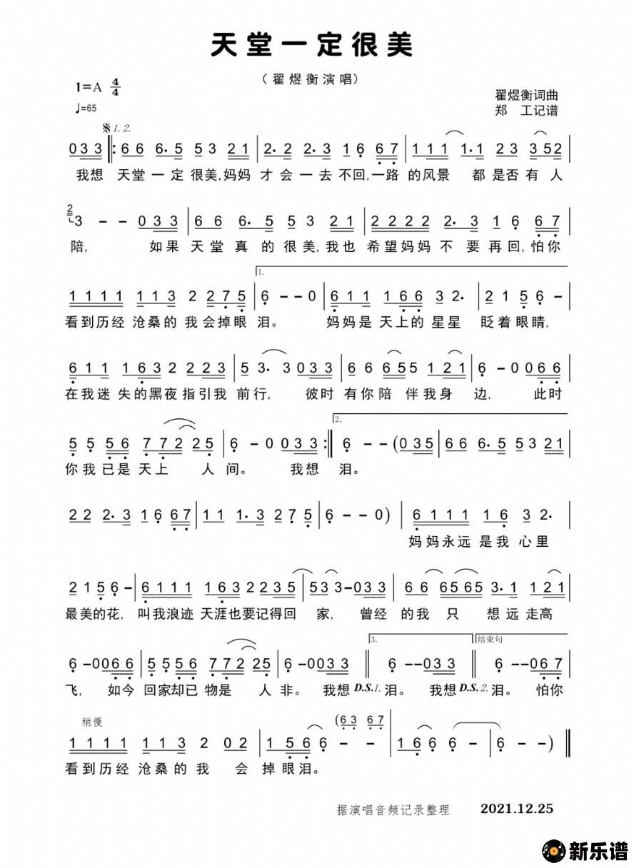 翟煜衡演唱的天堂一定很美歌词,天堂一定很美简谱.