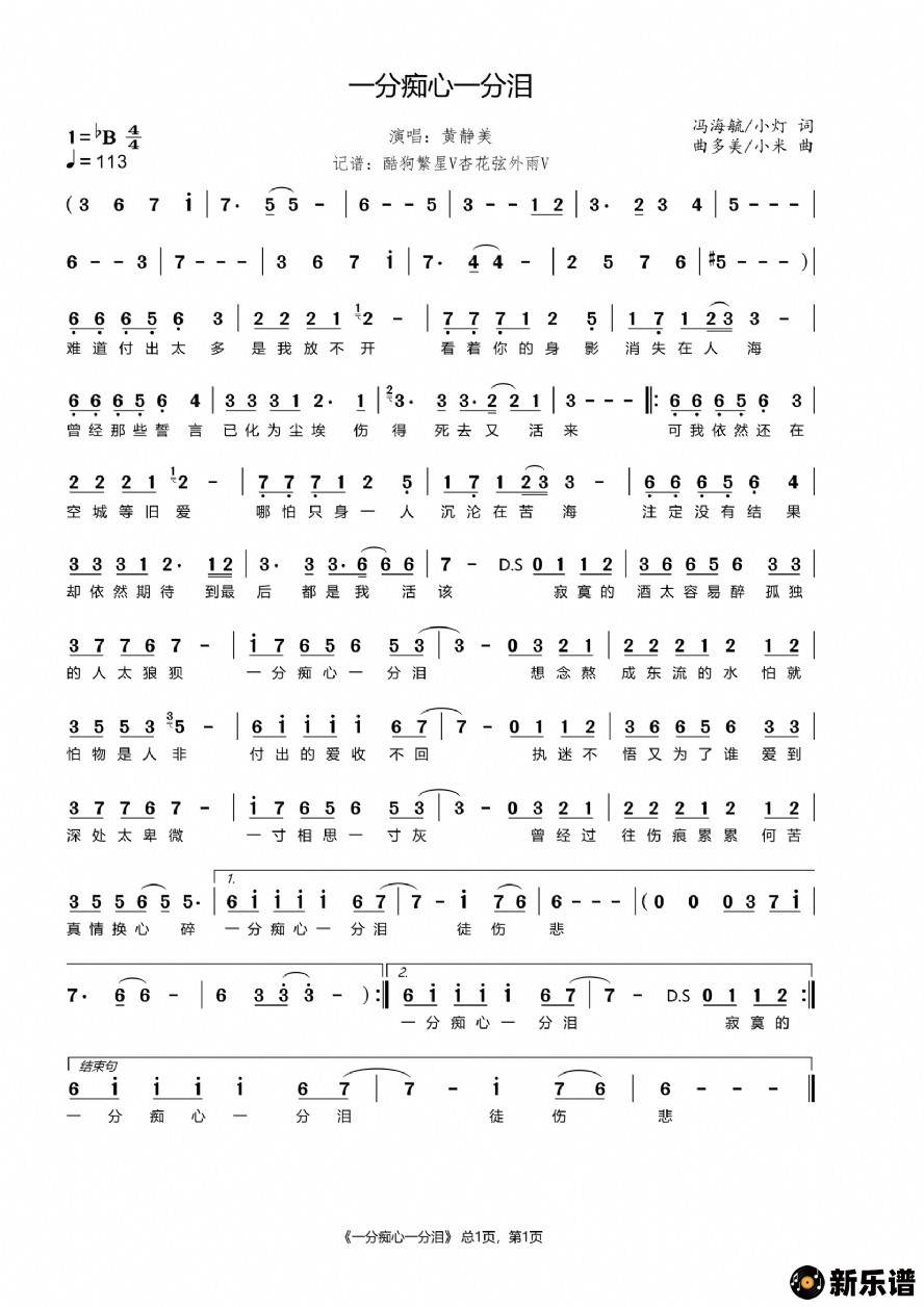 黄静美演唱的一分痴心一分泪歌词,一分痴心一分泪简谱.