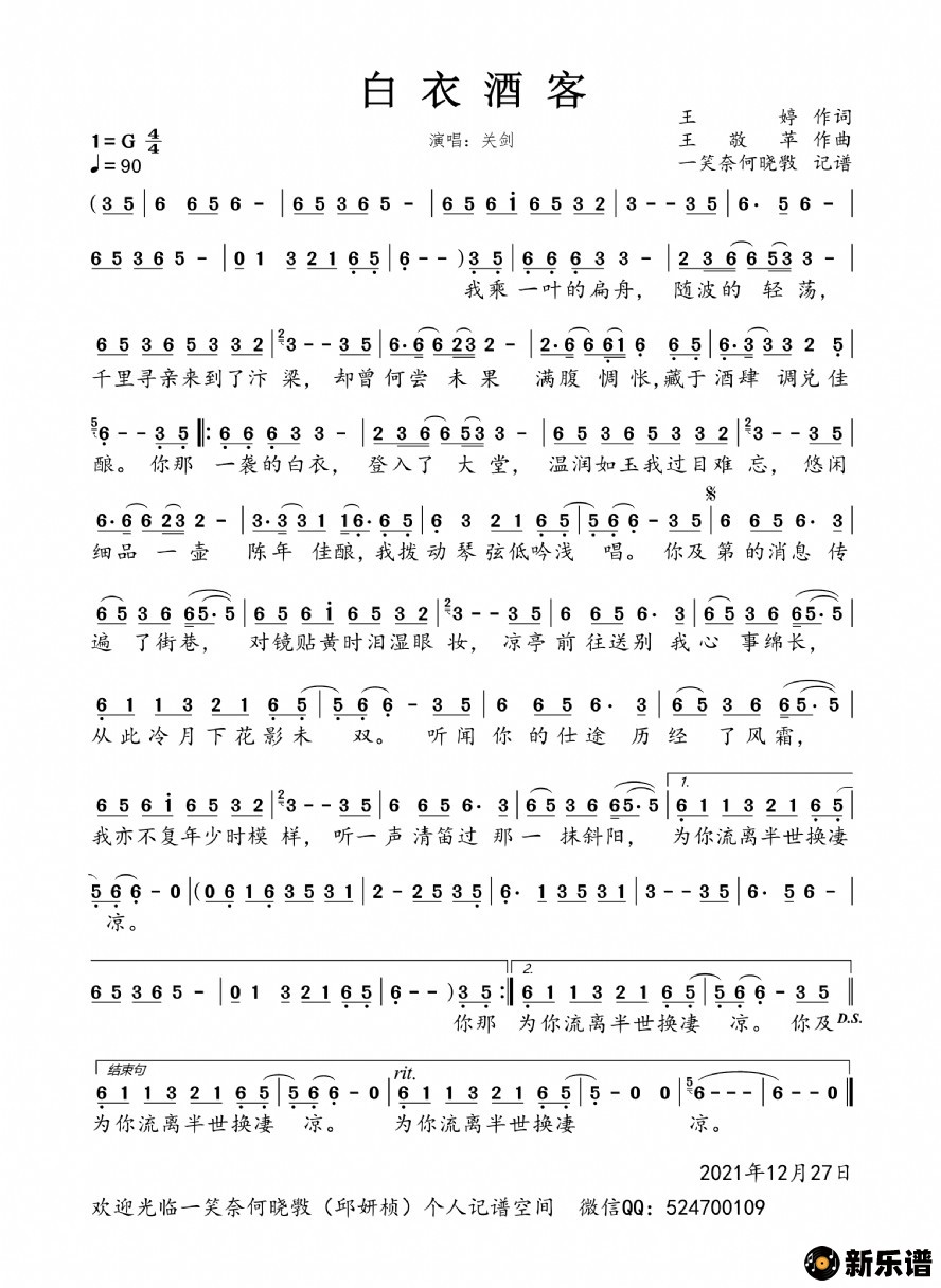 《白衣酒客》简谱 关剑-一笑奈何晓斅制谱