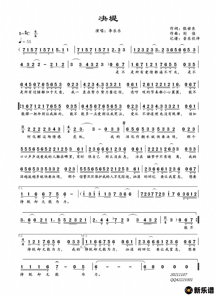 《决堤》简谱 李乐乐-音乐伙伴制谱