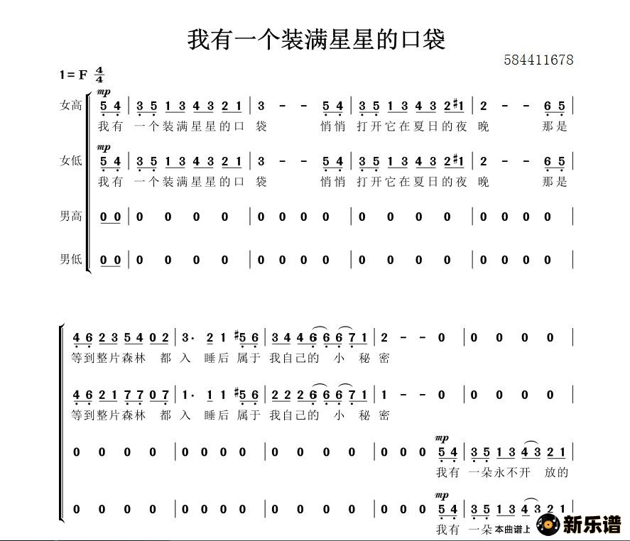 演唱的我有一个装满星星的口袋合唱简谱歌词,我有一个装满星星的口袋合唱简谱简谱.