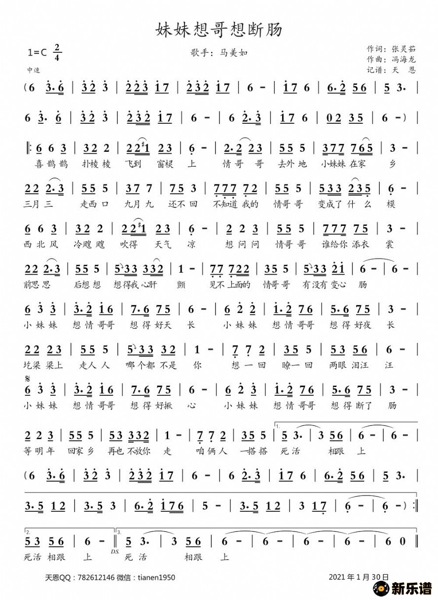 妹妹想哥想断肠马美如 马美如演唱的妹妹想哥想断肠歌词,妹妹想哥想断肠简谱. 喜鹊鹊扑棱棱飞到窗棂上情哥哥去外地小妹妹在家乡三月三走西口九月九还不回不知道我的情哥哥变成了什模样西北风冷飕飕吹得天气凉想问问情哥哥谁给你添衣裳前思思后想想想得我心肝颤见不上面的情哥哥有没有变心肠小妹妹想情哥哥想得好天长小妹妹想情哥哥想得好夜长圪梁梁上走人人哪个都不是你想一回瞭一回两眼泪汪汪小妹妹想情哥哥想得好揪心小妹妹想情哥哥想得断了肠等明年回家乡再也不放你走咱二人一搭搭死活相跟上喜鹊鹊扑棱棱飞到窗棂上情哥哥去外地小妹妹在家乡三月三走西口九月九还不回不知道我的情哥哥变成了什模样西北风冷飕飕吹得天气凉想问问情哥哥谁给你添衣裳前思思后想想想得我心肝颤见不上面的情哥哥有没有变心肠小妹妹想情哥哥想得好天长小妹妹想情哥哥想得好夜长圪梁梁上走人人哪个都不是你想一回瞭一回两眼泪汪汪小妹妹想情哥哥想得好揪心小妹妹想情哥哥想得断了肠等明年回家乡再也不放你走咱二人一搭搭死活相跟上小妹妹想情哥哥想得好揪心小妹妹想情哥哥想得断了肠等明年回家乡再也不放你走咱二人一搭搭死活相跟上 此简谱由新乐谱会员 天恩 上传