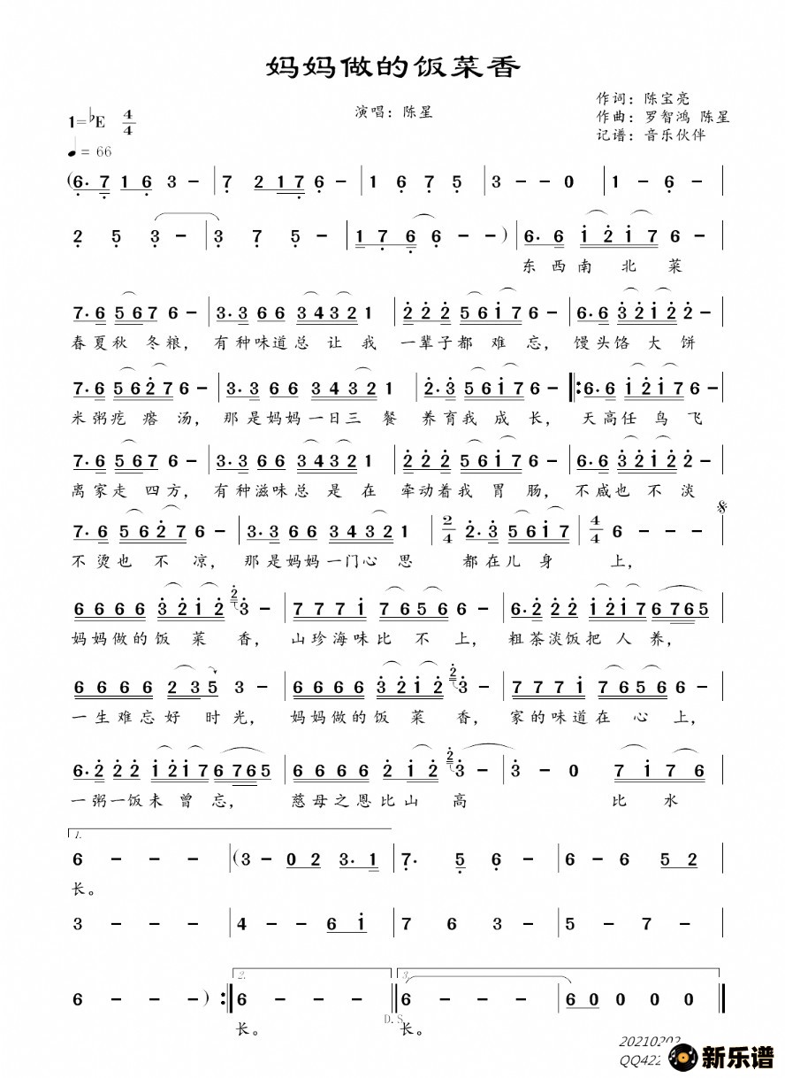 陈星演唱的妈妈做的饭菜香歌词,妈妈做的饭菜香简谱.