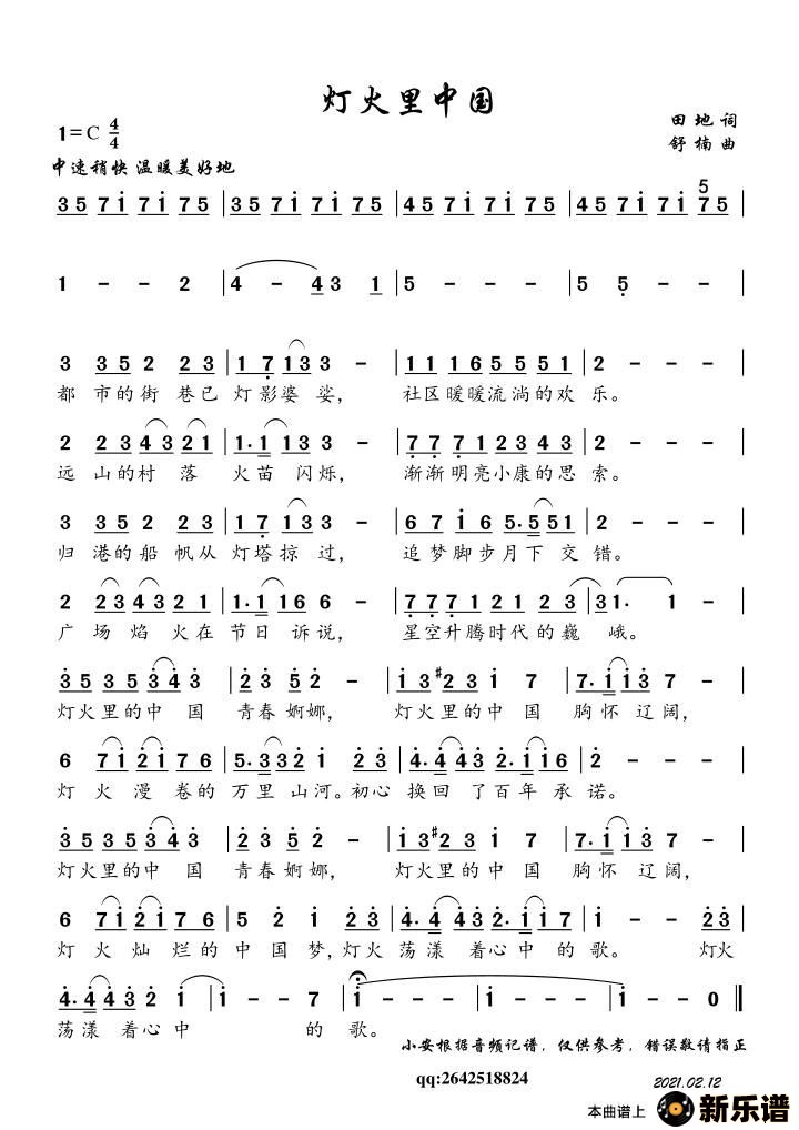 作词:田地 作曲:舒楠(简谱 廖昌永 王莉 张也 周深 春晚)