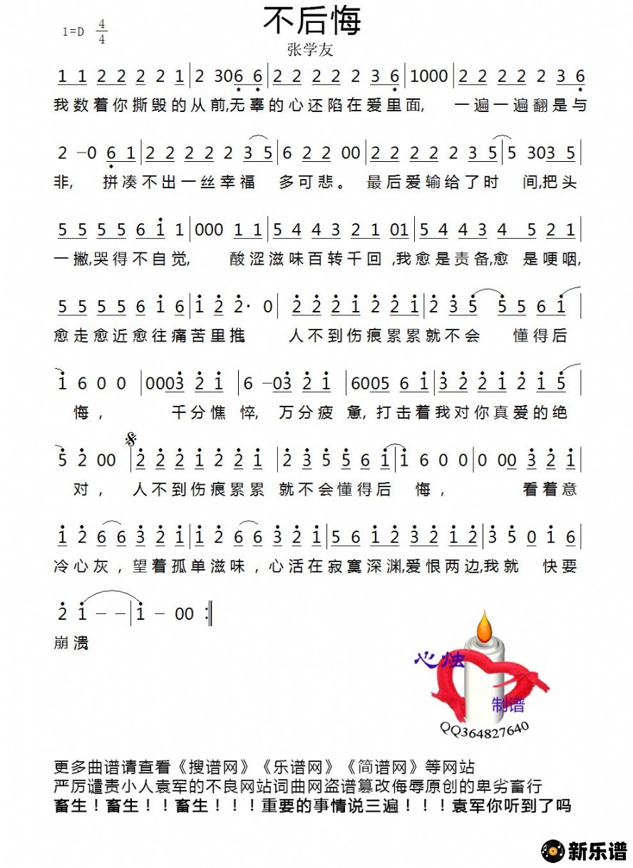 《不后悔》简谱 张学友-心烛制谱