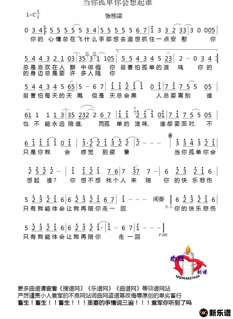 《当你孤单你会想起谁》简谱 张栋梁-心烛制谱