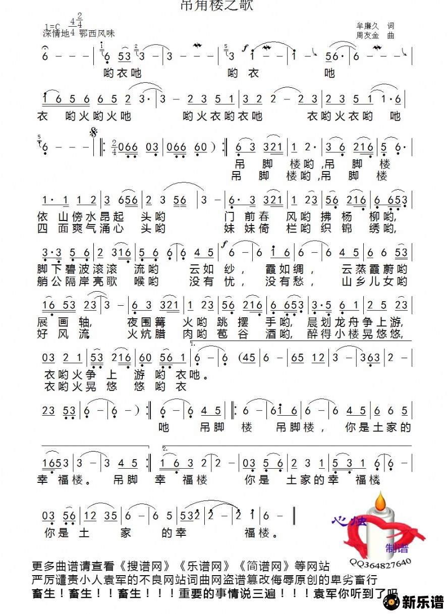 《吊脚楼之歌》简谱 佚名-心烛制谱