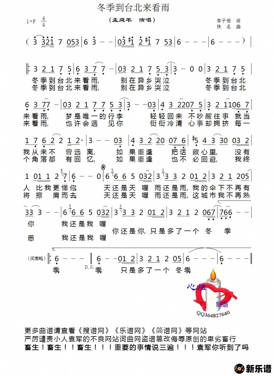 《冬季到台北来看雨》简谱 孟庭苇-心烛制谱