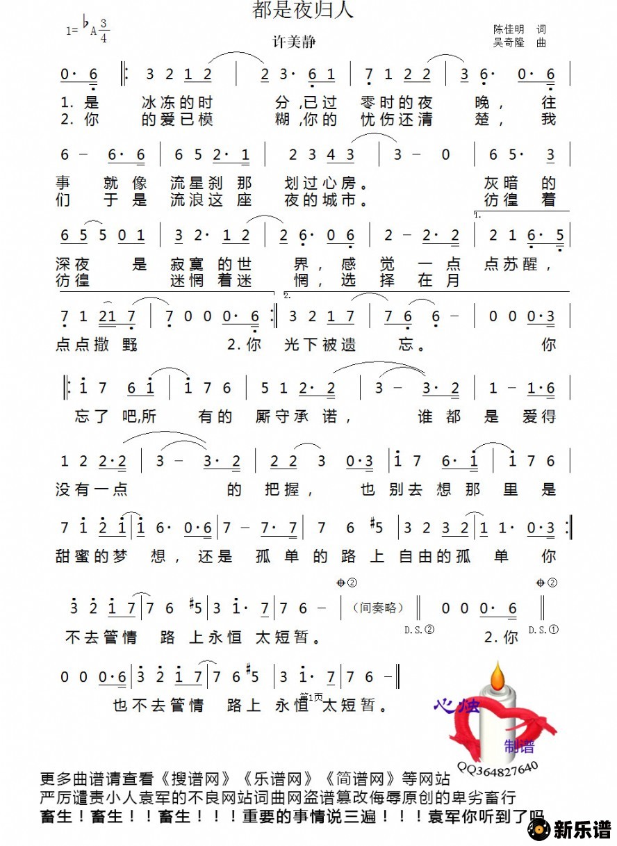 《都是夜归人》简谱 许美静-心烛制谱