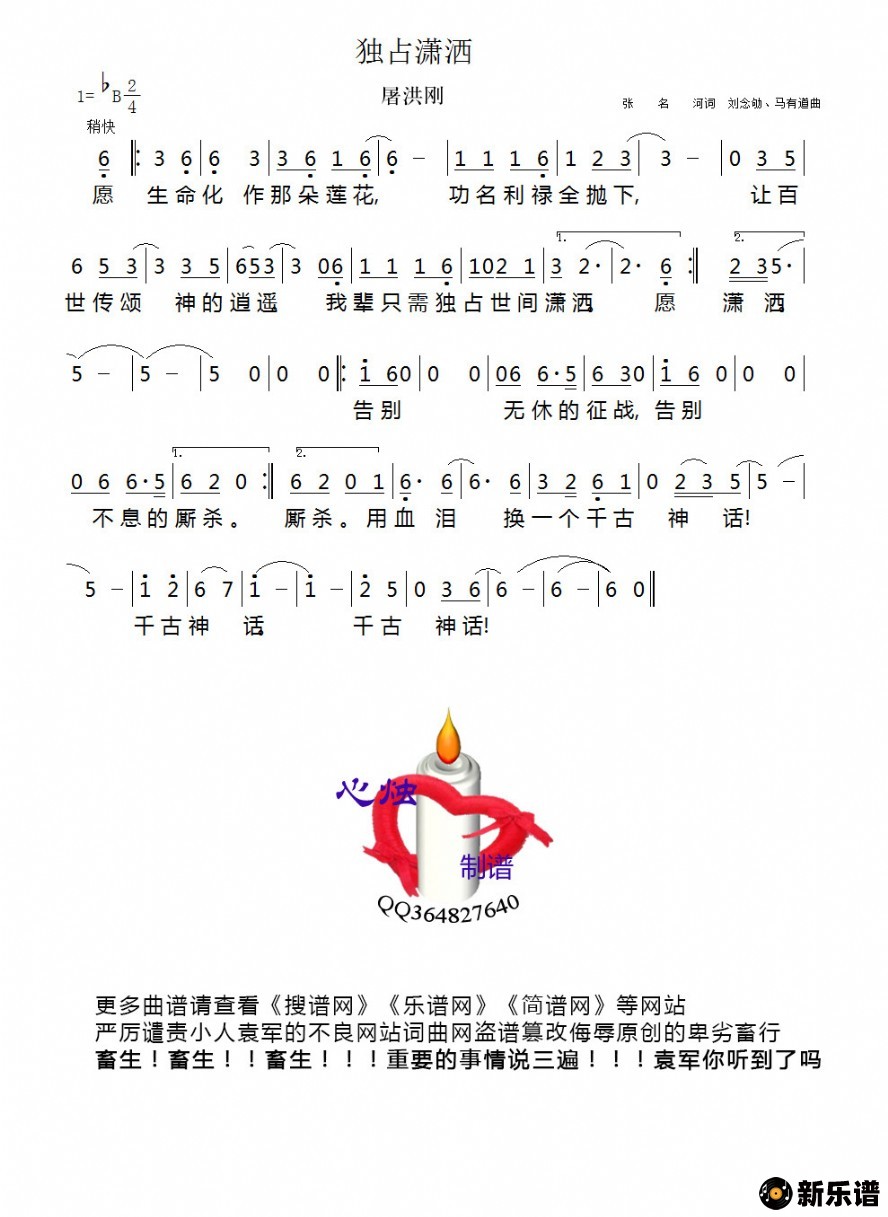 《独占潇洒》简谱 屠洪刚-心烛制谱