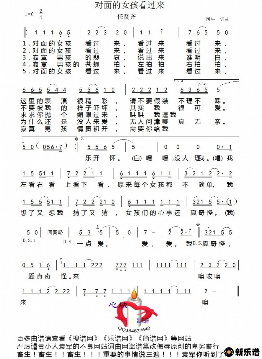 《对面的女孩看过来》简谱 任贤齐-心烛制谱