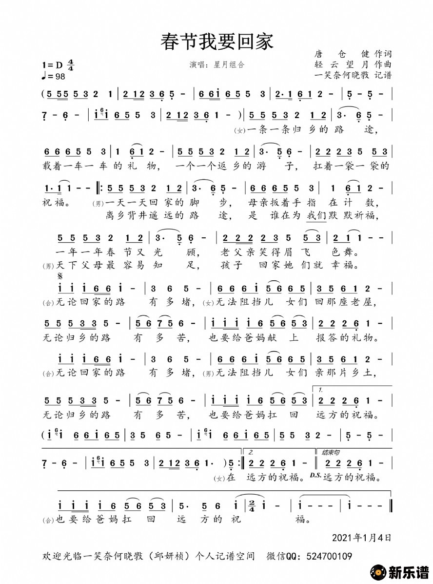 《春节我要回家(星月组合演唱版)》简谱 星月组合-一笑奈何晓斅制谱