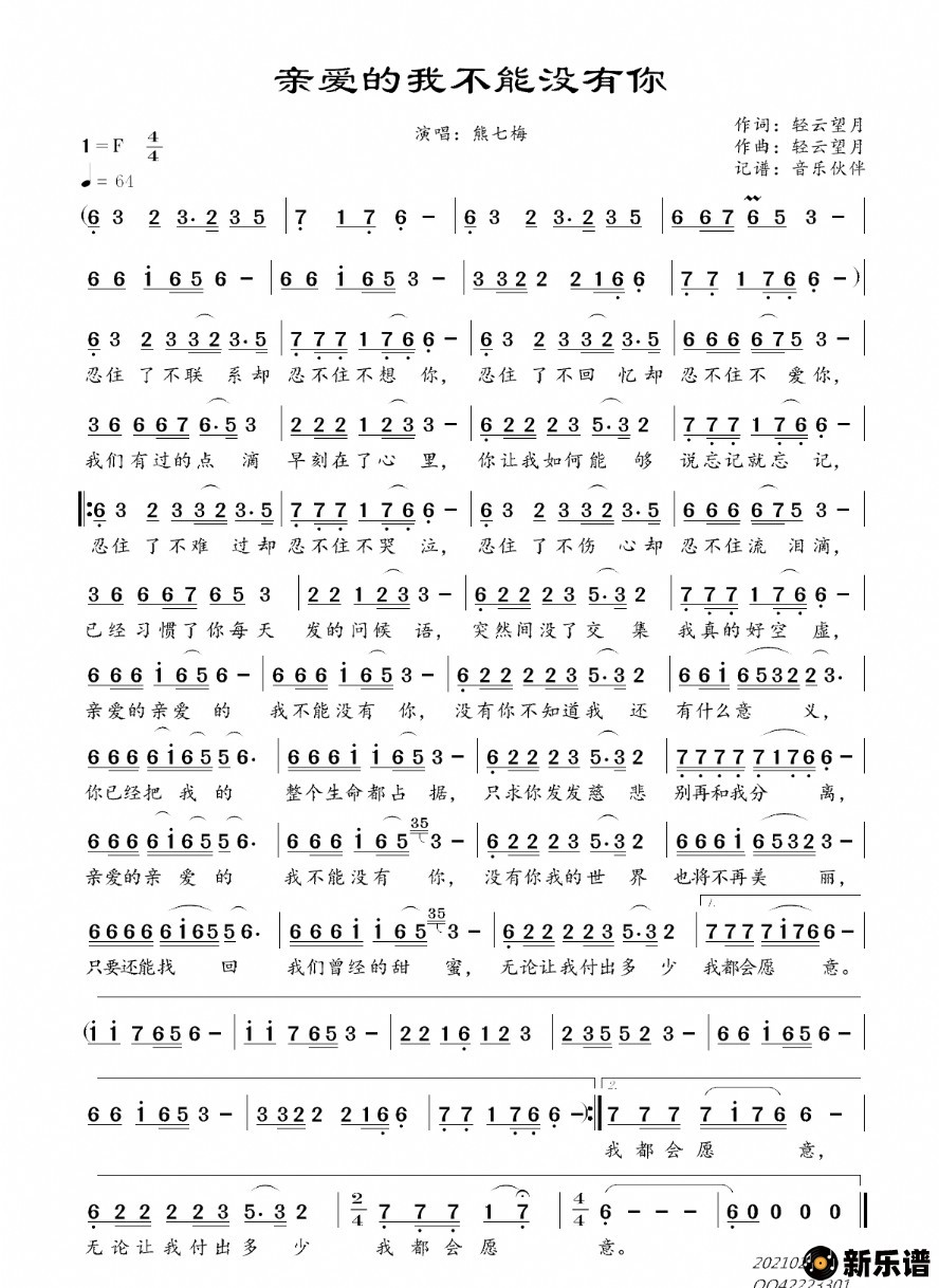 《亲爱的我不能没有你》简谱 熊七梅-音乐伙伴制谱