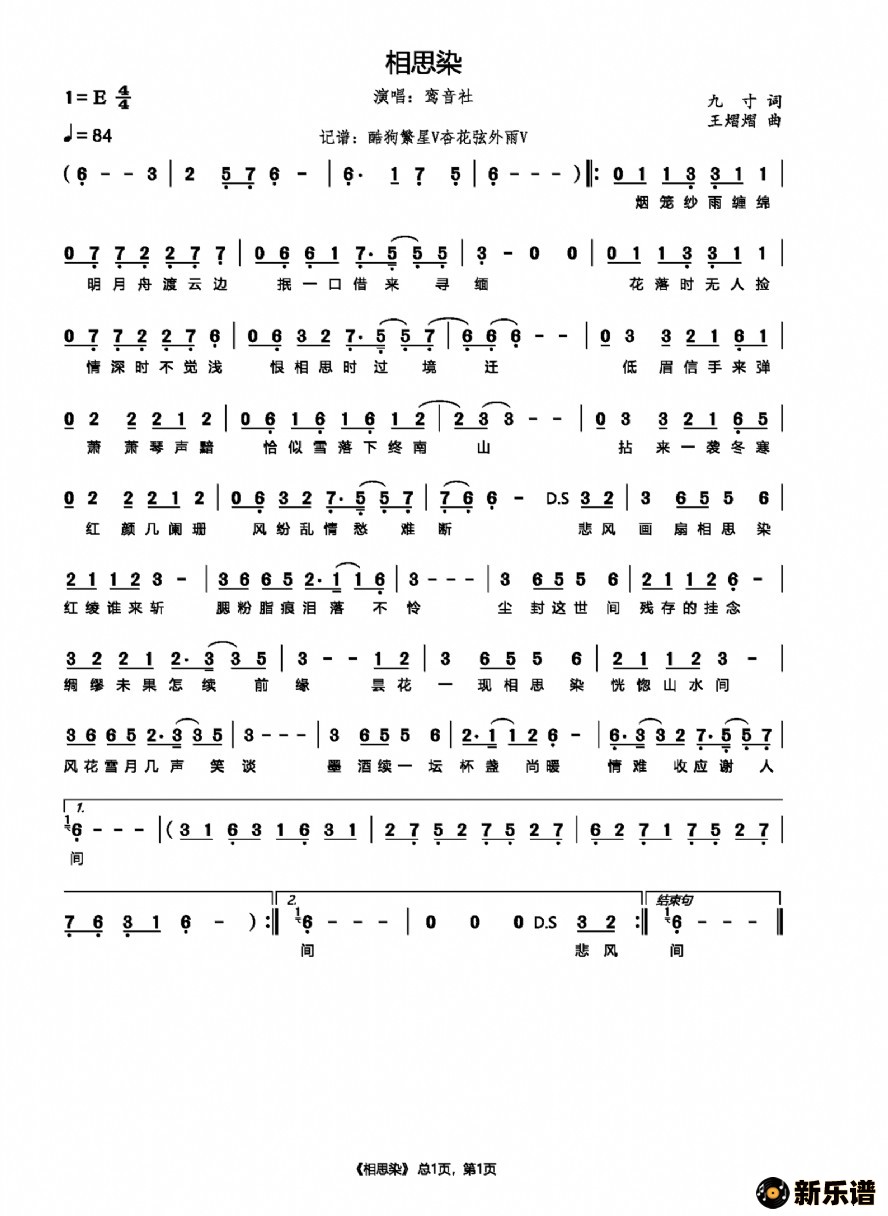 鸾音社演唱的相思染歌词,相思染简谱.