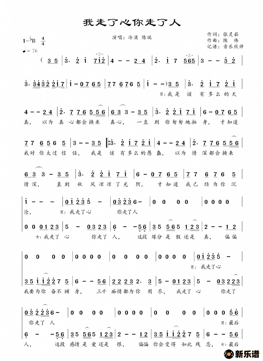 我走了心你走了人冷漠 冷漠演唱的我走了心你走了人歌词,我走了心你走了人简谱. 冷漠:我是该有多么的天真以为真心都会换来真心一直到你匆匆地抽身才知道我对你太过信任我是该有多么的愚蠢以为情深都会换来情深直到秋风凉凉了光阴才知道我已经为你沉沦陈瑞:我走了心 你走了人这段缘分是假还是真偏偏我要为你奋不顾身三千痴情都为你用尽我走了心 你走了人这段感情是爱还是恨偏偏你会变得如此残忍合:最后给我留下满身伤痕冷漠:我是该有多么的愚蠢以为情深都会换来情深直到秋风凉凉了光阴才知道我已经为你沉沦陈瑞:我走了心 你走了人这段缘分是假还是真偏偏我要为你奋不顾身三千痴情都为你用尽我走了心 你走了人这段感情是爱还是恨偏偏你会变得如此残忍合:最后给我留下满身伤痕陈瑞:最后给我留下满身伤痕 此简谱由新乐谱会员 音乐伙伴 上传