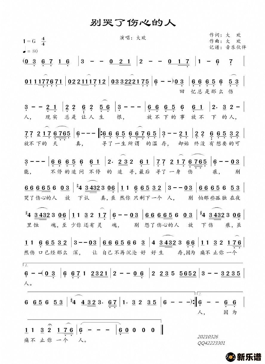 《别哭了伤心的人》简谱 大欢-音乐伙伴制谱