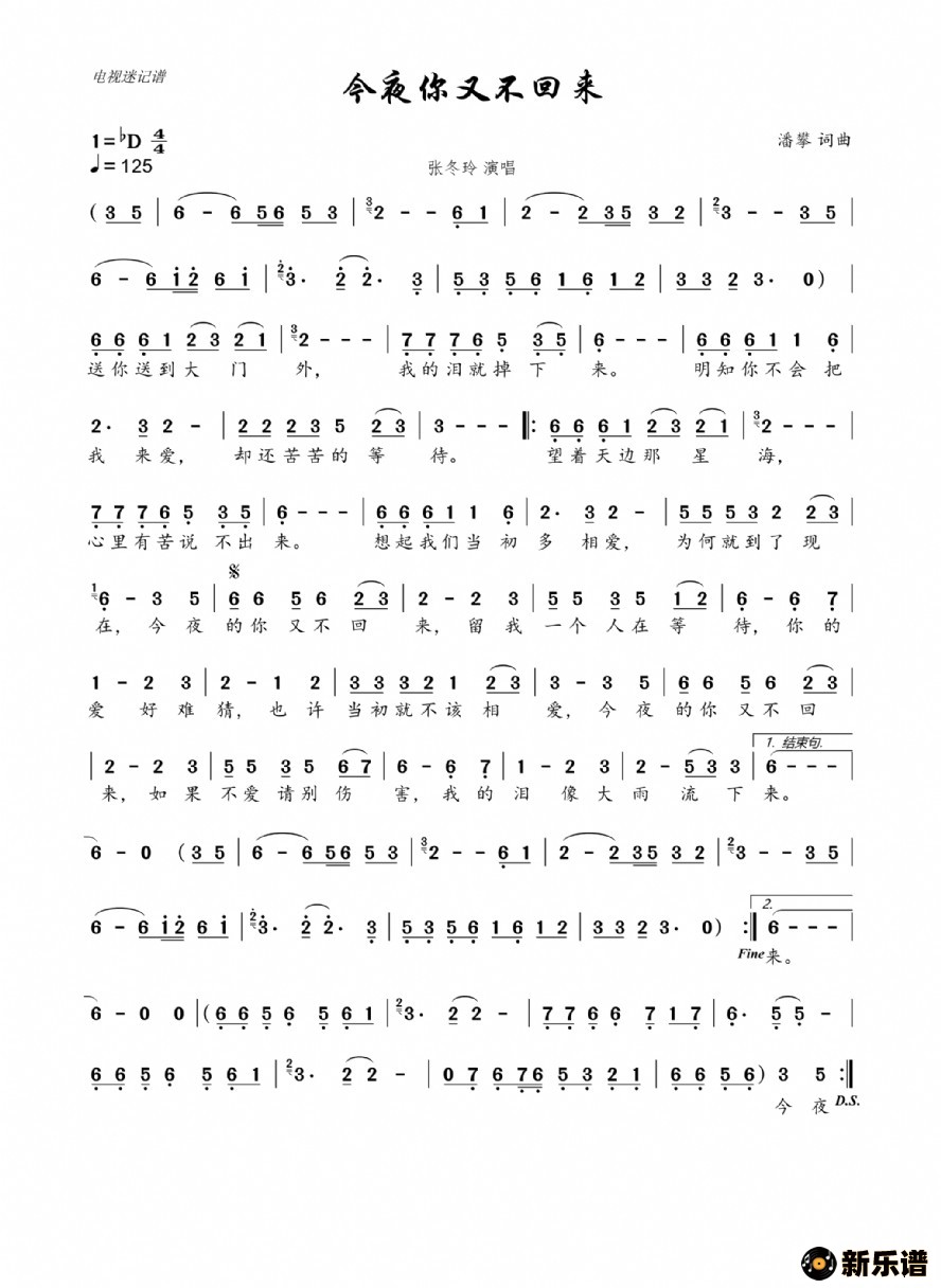 今夜你又不回来张冬玲 张冬玲演唱的今夜你又不回来歌词,今夜你又不回来简谱. 送你送到大门外我的泪就掉下来明知你不会把我来爱却还苦苦的等待望着天边那星海心里有苦说不出来想起我们当初多相爱为何就到了现在今夜的你又不回来留我一个人在等待你的爱 好难猜也许当初就不该相爱今夜的你又不回来如果不爱请别伤害我的泪 像大雨 流下来望着天边那星海心里有苦说不出来想起我们当初多相爱为何就到了现在今夜的你又不回来留我一个人在等待你的爱 好难猜也许当初就不该相爱今夜的你又不回来如果不爱请别伤害我的泪 像大雨 流下来今夜的你又不回来留我一个人在等待你的爱 好难猜也许当初就不该相爱今夜的你又不回来如果不爱请别伤害我的泪 像大雨 流下来