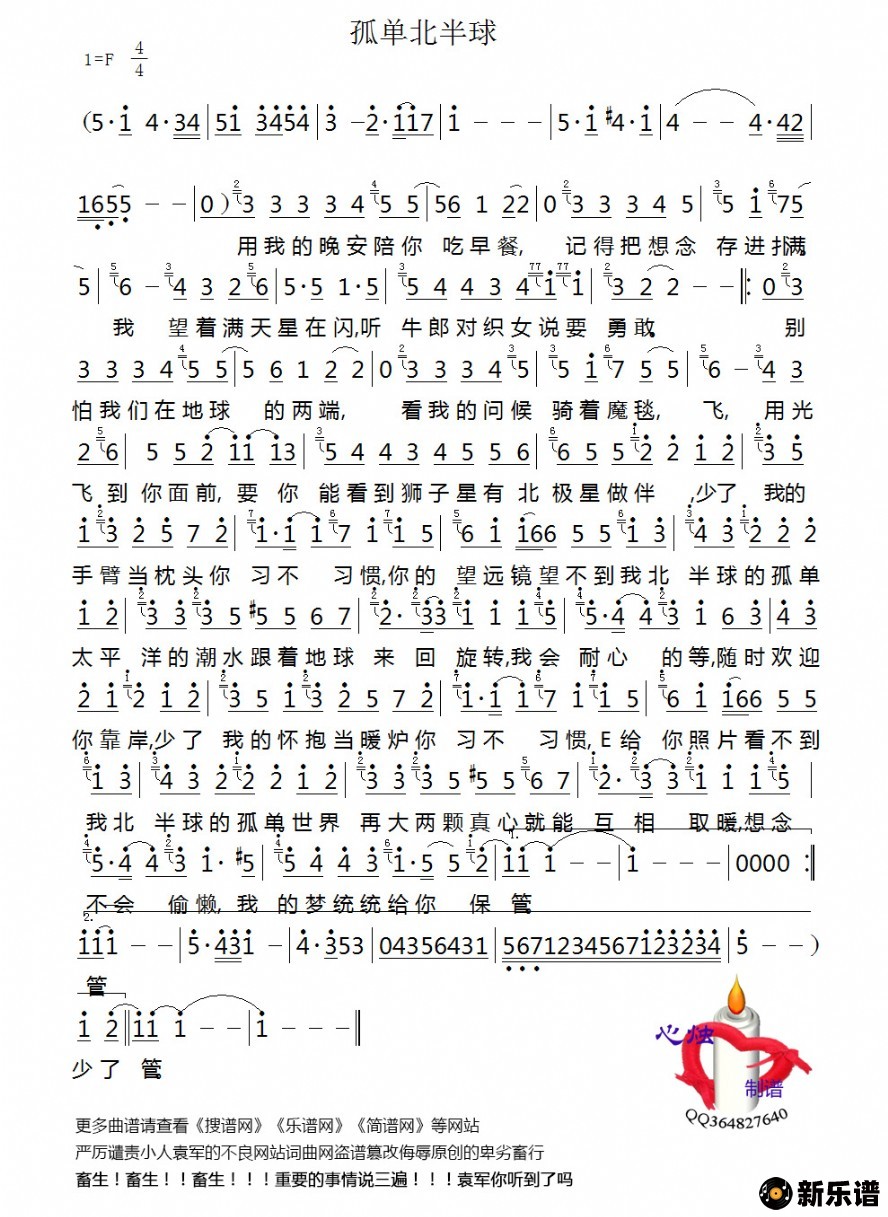 《孤单北半球》简谱 梁静茹-心烛制谱