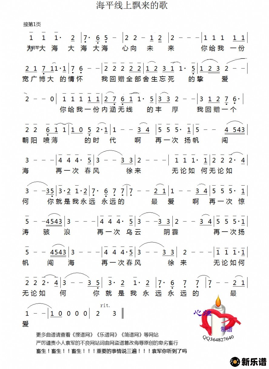 《海平线上飘来的歌》简谱 佚名-心烛制谱