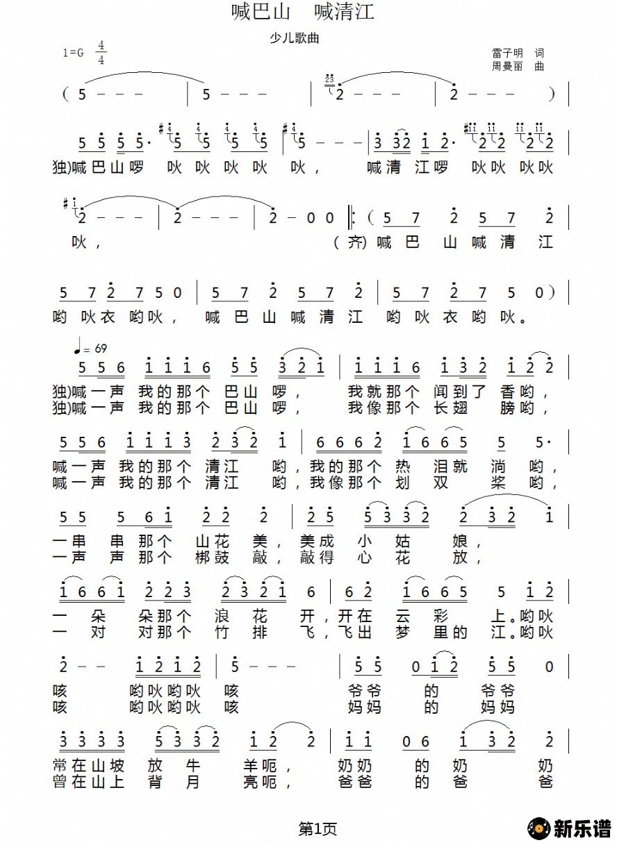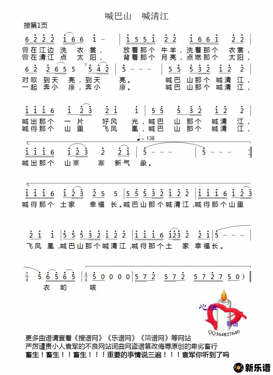 《喊巴山 喊清江》简谱 黄李睿希-心烛制谱
