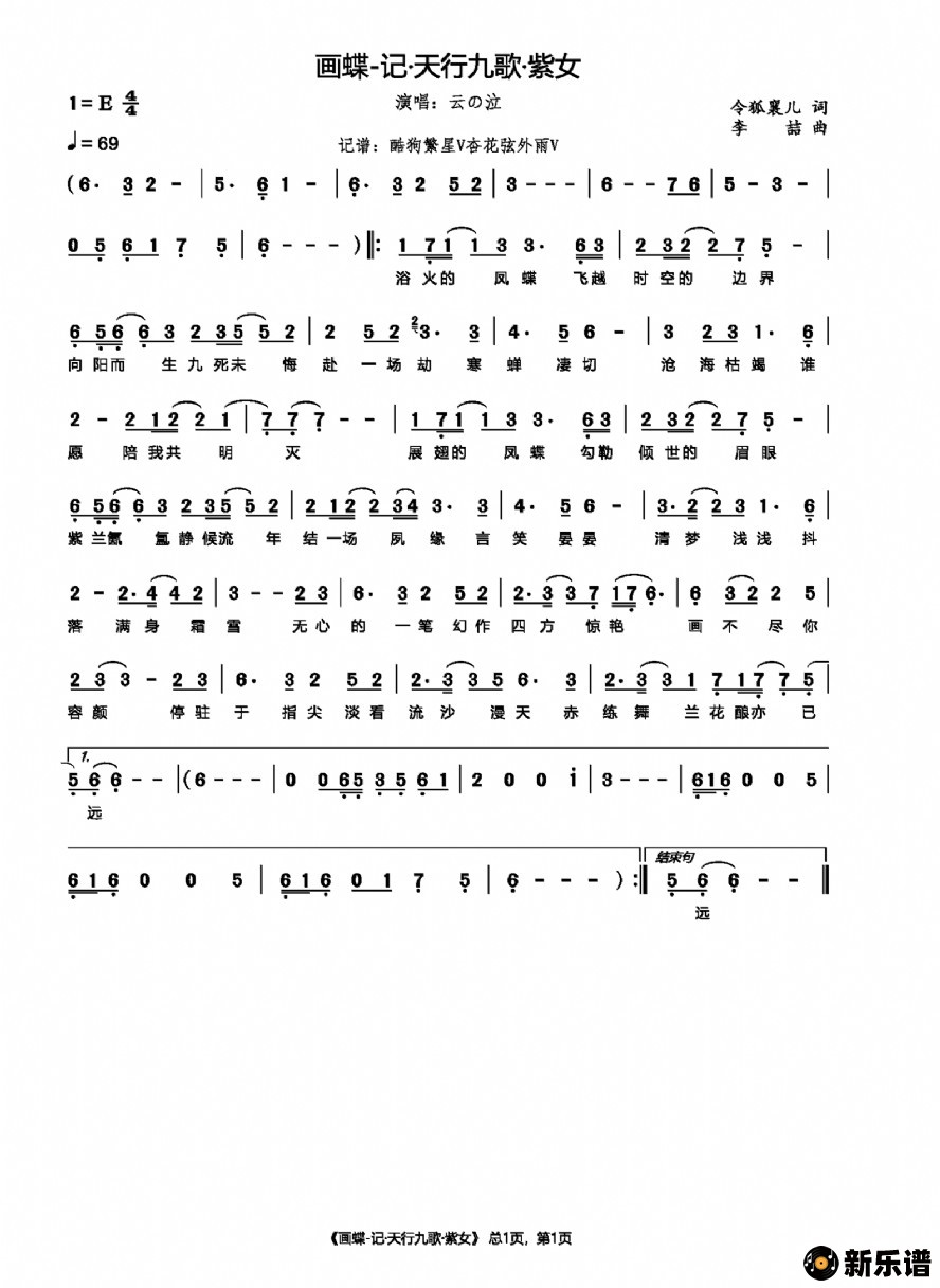 云の泣演唱的画蝶-记·天行九歌·紫女歌词,画蝶-记·天行九歌·紫女简谱.